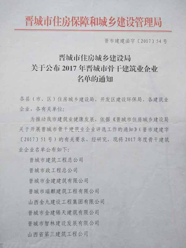 2017年5月4日,接晉城市住房城鄉(xiāng)建設(shè)局有關(guān)通知,晉城市金建建筑有限公司入選2017年晉城市骨干建筑業(yè)企業(yè)名單。2017年晉城市骨干建筑業(yè)企業(yè)自公布之日起,“骨干建筑業(yè)企業(yè)”稱號(hào)有效期一年。今后,每年評(píng)選一次,每年****季度評(píng)選完成,“骨干建筑業(yè)企業(yè)”稱號(hào)有效期一年。